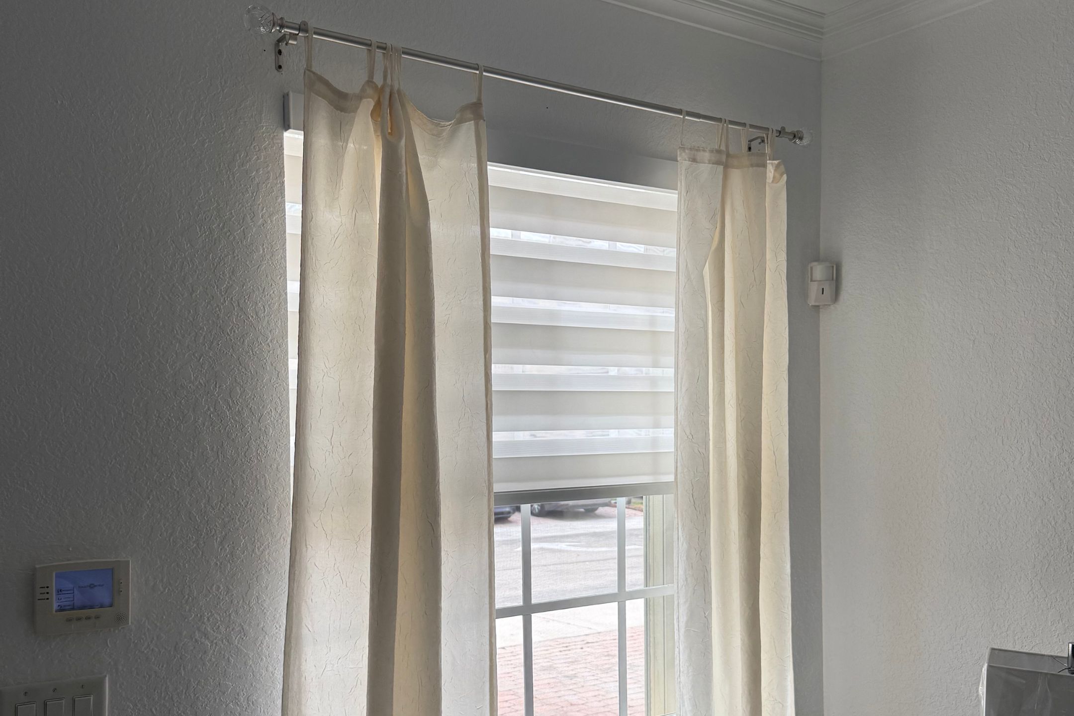 Modern window treatments including zebra, blackout, and roller shades for style and privacy.
